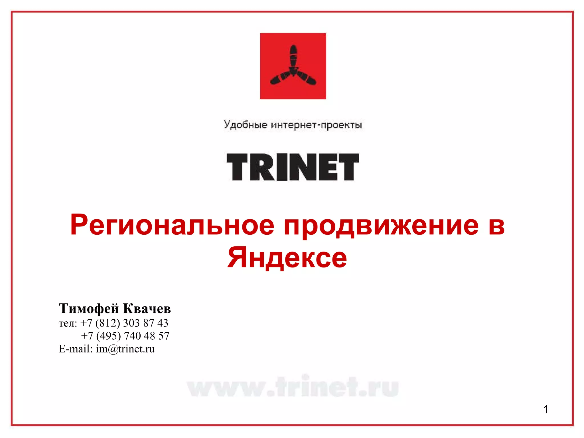 Документ содержит рекомендации по региональному продвижению сайтов в Яндексе, включая создание регистраций, определения регионов и факторы, влияющие на SEO. Он обсуждает мифы о региональном продвижении и дает советы по правильному выбору региона и контента. Также представлены контактные данные автора для дальнейших вопросов.