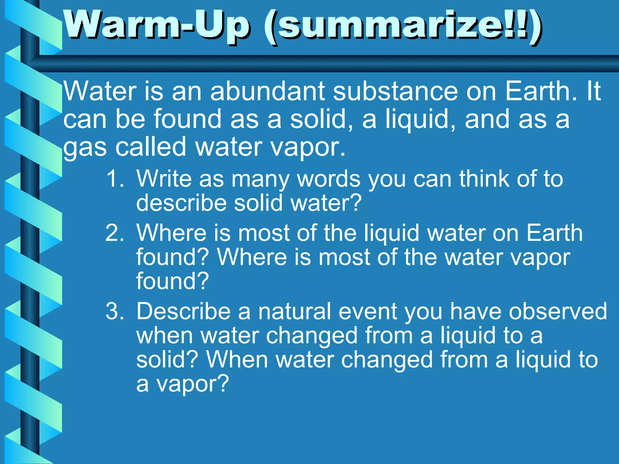 The document discusses phase changes in matter. It defines phase changes as changes of state that occur when energy is added to or removed from a substance, causing its temperature to remain constant. There are six types of phase changes: melting, freezing, vaporization, condensation, sublimation, and deposition. Phase changes can be visualized through temperature vs. time graphs where the temperature plateaus during a change of state. Phase changes can also be classified as endothermic or exothermic depending on whether energy is absorbed or released during the change.