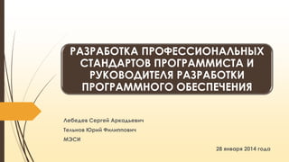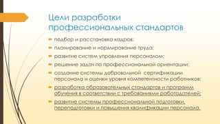 Документ посвящен разработке профессиональных стандартов для программистов и руководителей разработки программного обеспечения, определяя цели, квалификационные уровни и трудовые функции. Он рассматривает необходимость создания системы сертификации персонала, а также специфицирует обязанности и квалификационные требования для различных уровней специалистов. Также документ указывает на существующие несоответствия в профессиональных стандартах и необходимость их доработки.