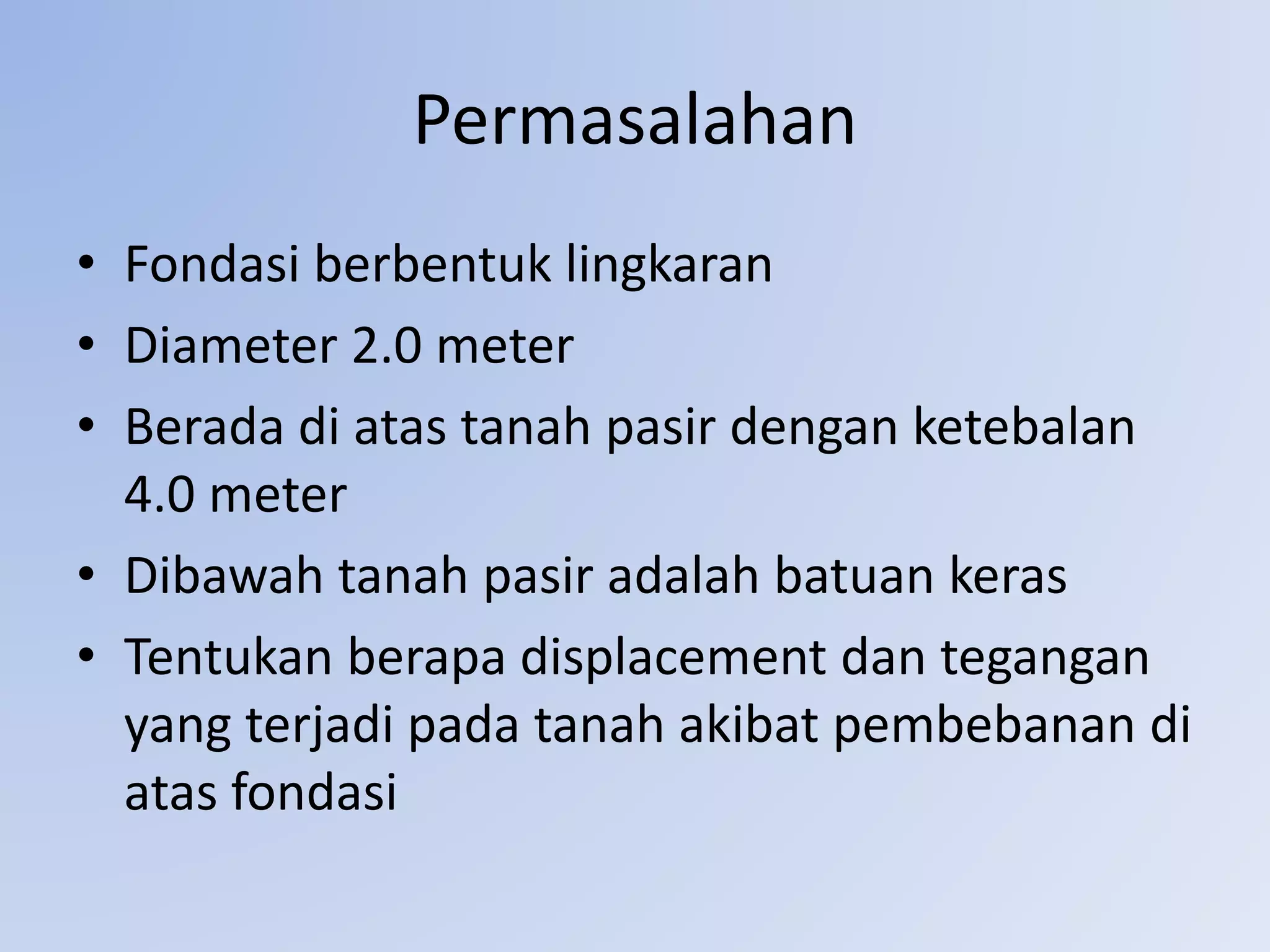 Dokumen ini menjelaskan prosedur penggunaan perangkat lunak Plaxis untuk menganalisis fondasi berbentuk lingkaran berdiameter 2 meter yang berada di atas tanah pasir. Proses mencakup pengaturan input, pemodelan geometri, penentuan syarat batas, pengisian data material, generasi mesh, dan eksekusi kalkulasi untuk menentukan displacement dan tegangan. Juga dibahas modifikasi input untuk fondasi fleksibel dan hasil analisis output dari perhitungan.