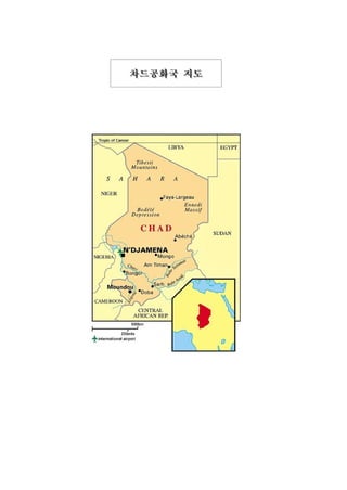 This document provides a summary of key information about Chad in Korean. It includes details about Chad's geography, demographics, economy, trade, debt levels, and World Bank support programs. Some key facts presented are that Chad's population is over 10 million, its GDP per capita is $540, agriculture accounts for 20.5% of GDP, and its total external debt in 2006 was $1.77 billion.