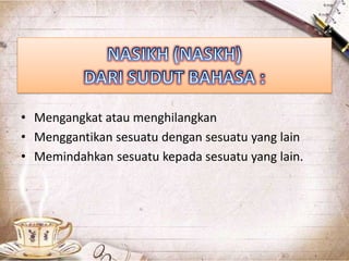 Dokumen ini membahas konsep nasikh dan mansukh dalam hukum syarak, menggambarkan bagaimana hukum dapat dibatalkan dan digantikan oleh hukum yang baru. Terdapat pembagian types of nasakh, termasuk nasakh antara Al-Quran dan sunnah dan berbagai jenis penggantian hukum. Hikmah di balik nasakh menunjukkan bahwa syariat Islam adalah relevan dan berfungsi untuk mengatur kemaslahatan manusia.