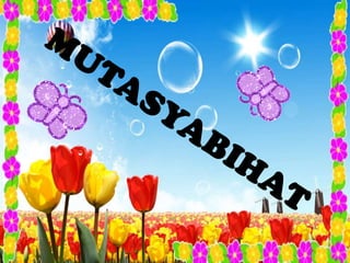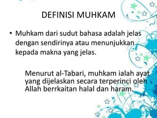 Dokumen ini membahas perbedaan antara ayat muhkam, yang jelas dan tegas, dan ayat mutasyabih, yang samar dan memerlukan penjelasan. Ayat muhkam memudahkan pemahaman ajaran Al-Qur'an, sementara ayat mutasyabih menguji keimanan dan mendorong eksplorasi lebih lanjut dari pengkajinya. Penjelasan dari ayat-ayat ini menegaskan titik penting dalam studi Al-Qur'an dan potensi kesalahpahaman jika tidak dipahami dengan baik.