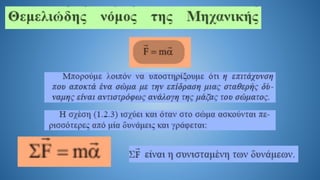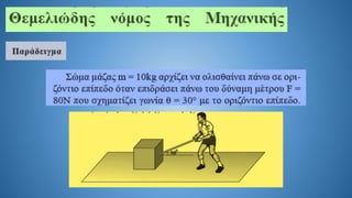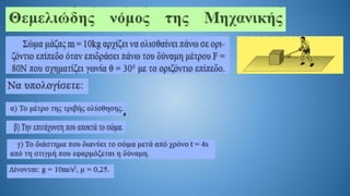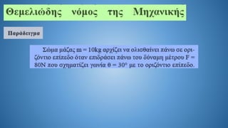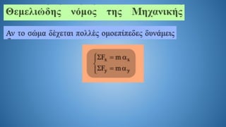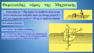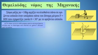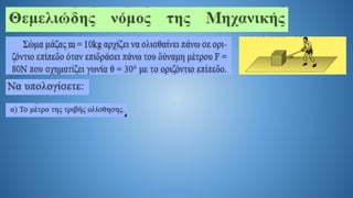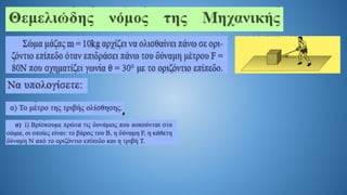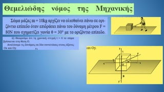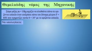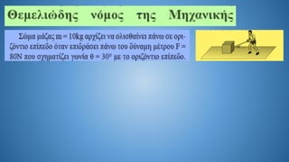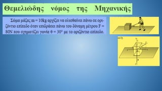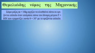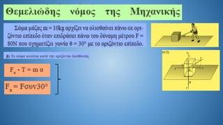 The document discusses Newton's second law in a two-dimensional context, demonstrating calculations related to forces and acceleration. It includes specific numerical examples, revealing values such as acceleration (α = 5.4 m/s²) and displacement (s = 43.2 m). The overall focus is on illustrating the application of Newton's laws through calculations.