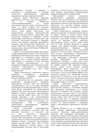 Документ описывает способ диагностики функционального нарушения проходимости маточных труб, применяемый в гинекологии для улучшения диагностики бесплодия. Метод включает контрастную эхогистеросальпингоскопию с двухсторонней блокадой круглой связки матки при отсутствии контраста в брюшной полости, что позволяет повысить достоверность диагностики. Предложенная методика была испытана на 18 больных, у которых восстановление проходимости труб было подтверждено на практике.