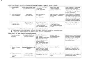 This document provides definitions and formulas for various types of financial ratios used to analyze a company's liquidity, capital structure, coverage, turnover/activity, and profitability.