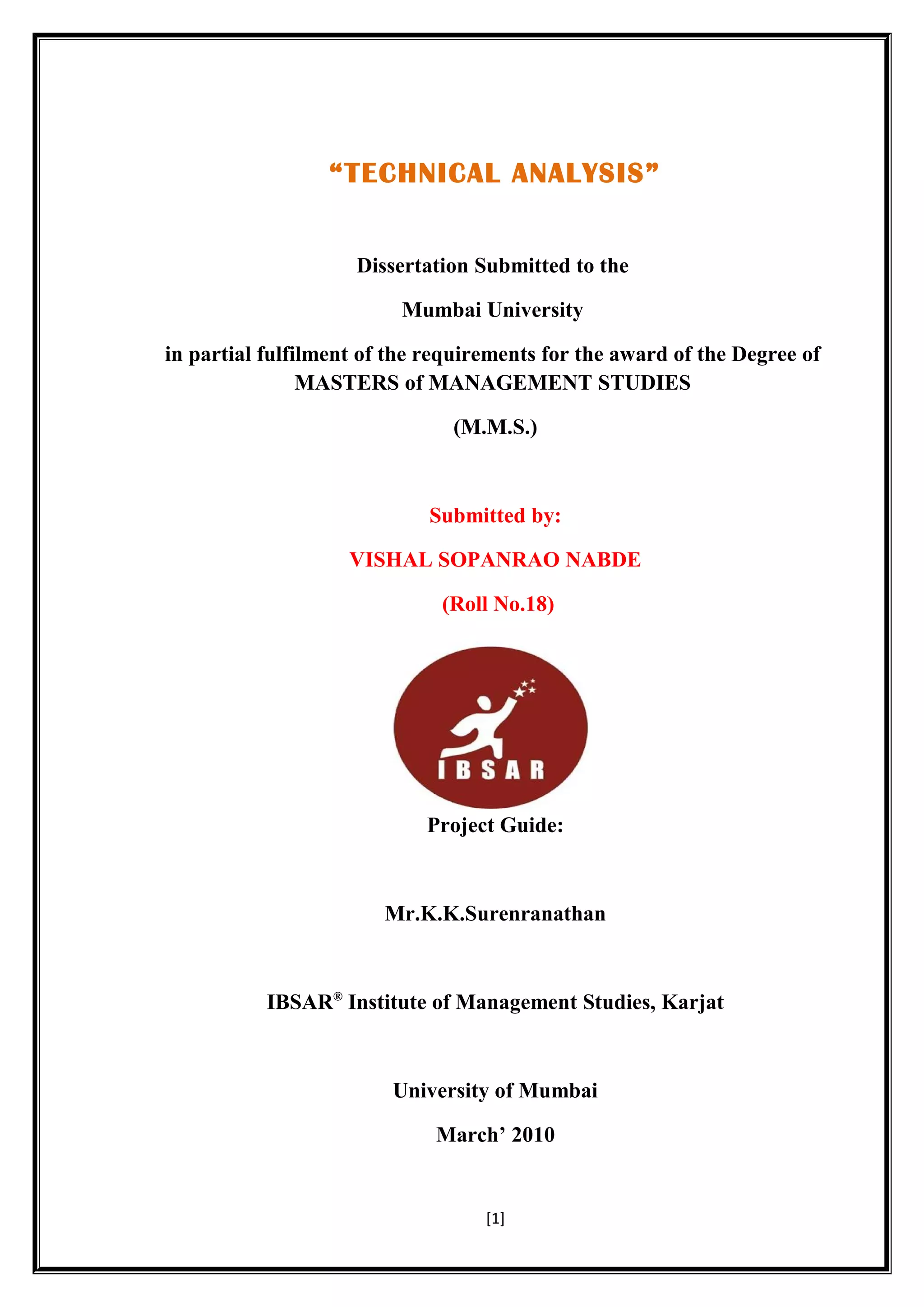 This document is Vishal Nabde's dissertation submitted to Mumbai University for his Masters in Management Studies degree. It examines the topic of technical analysis. The dissertation includes declarations, acknowledgements, a table of contents, and 10 chapters that will analyze technical analysis tools and indicators and apply them to study the stock of Power Grid. It aims to understand how technical analysis can be used to predict short-term stock price movements.