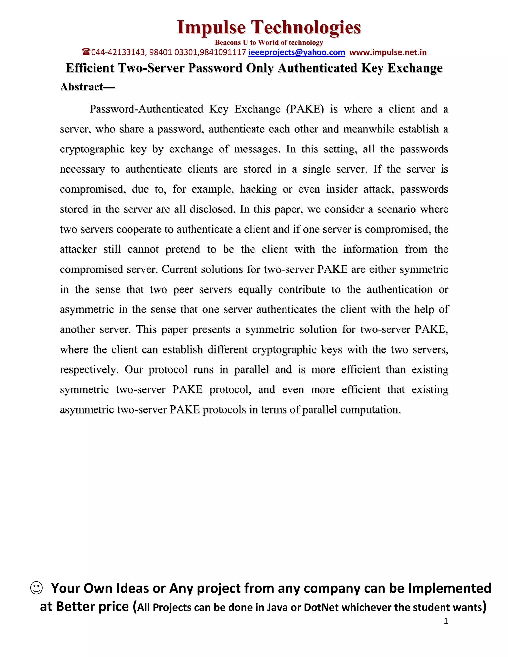 This document discusses an efficient two-server password-only authenticated key exchange (PAKE) protocol designed to strengthen security by minimizing the risks associated with server compromise. It presents a symmetric solution allowing a client to establish distinct cryptographic keys with two cooperating servers while maintaining effective authentication. The proposed approach is noted for its improved efficiency over existing two-server PAKE protocols, making it suitable for application in various technology projects.