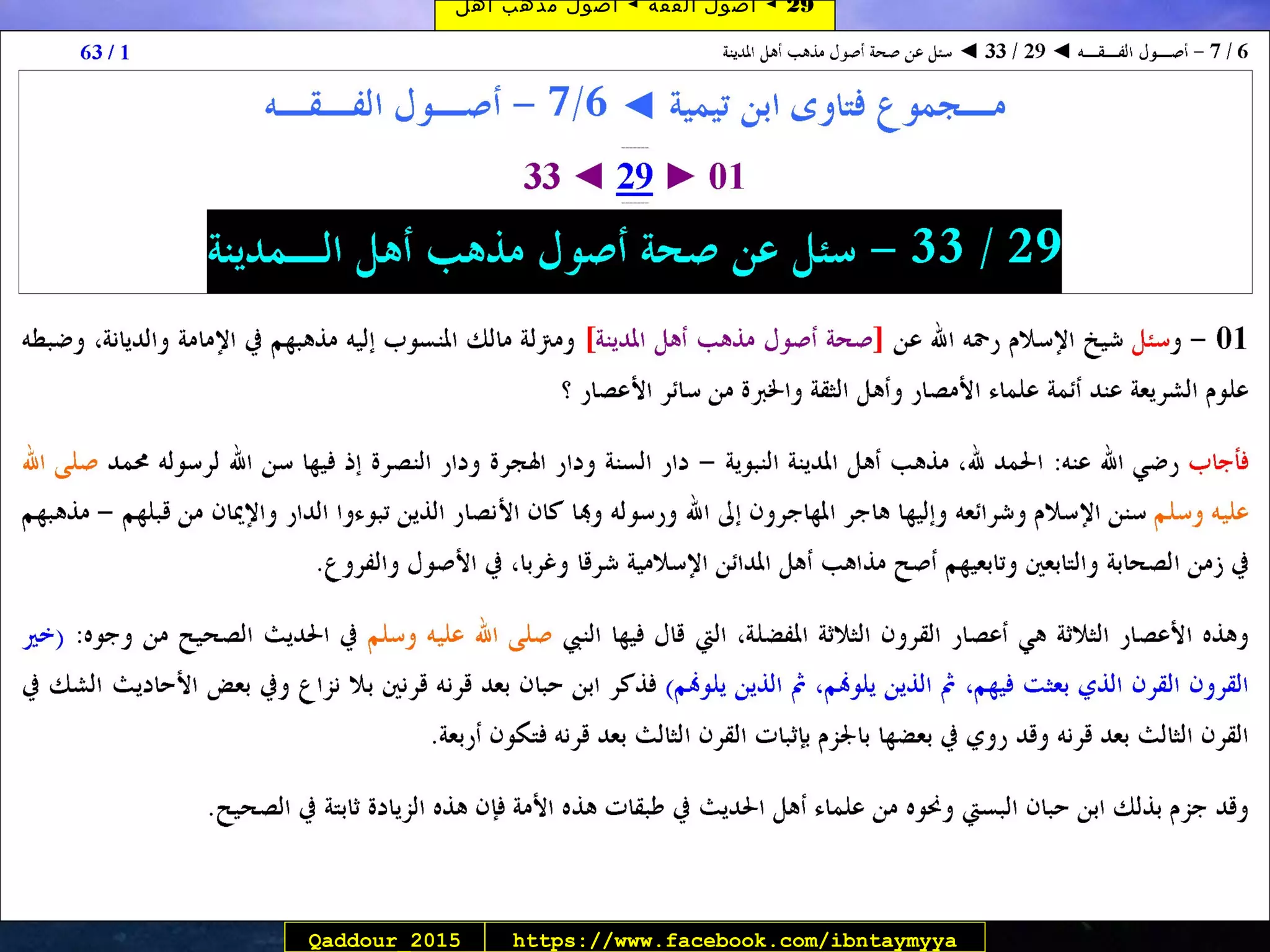 صفحة شيخ الاسلام ابن تيمية على الفيسبوك https://www.facebook.com/ibntaymyya ------- مـجموع فتاوى ابن تيمية ◄ أصـول الفـقـه ------- 29 / 33 - سئل عن صحة أصول مذهب أهل الـمدينة ------- 63 صفحة