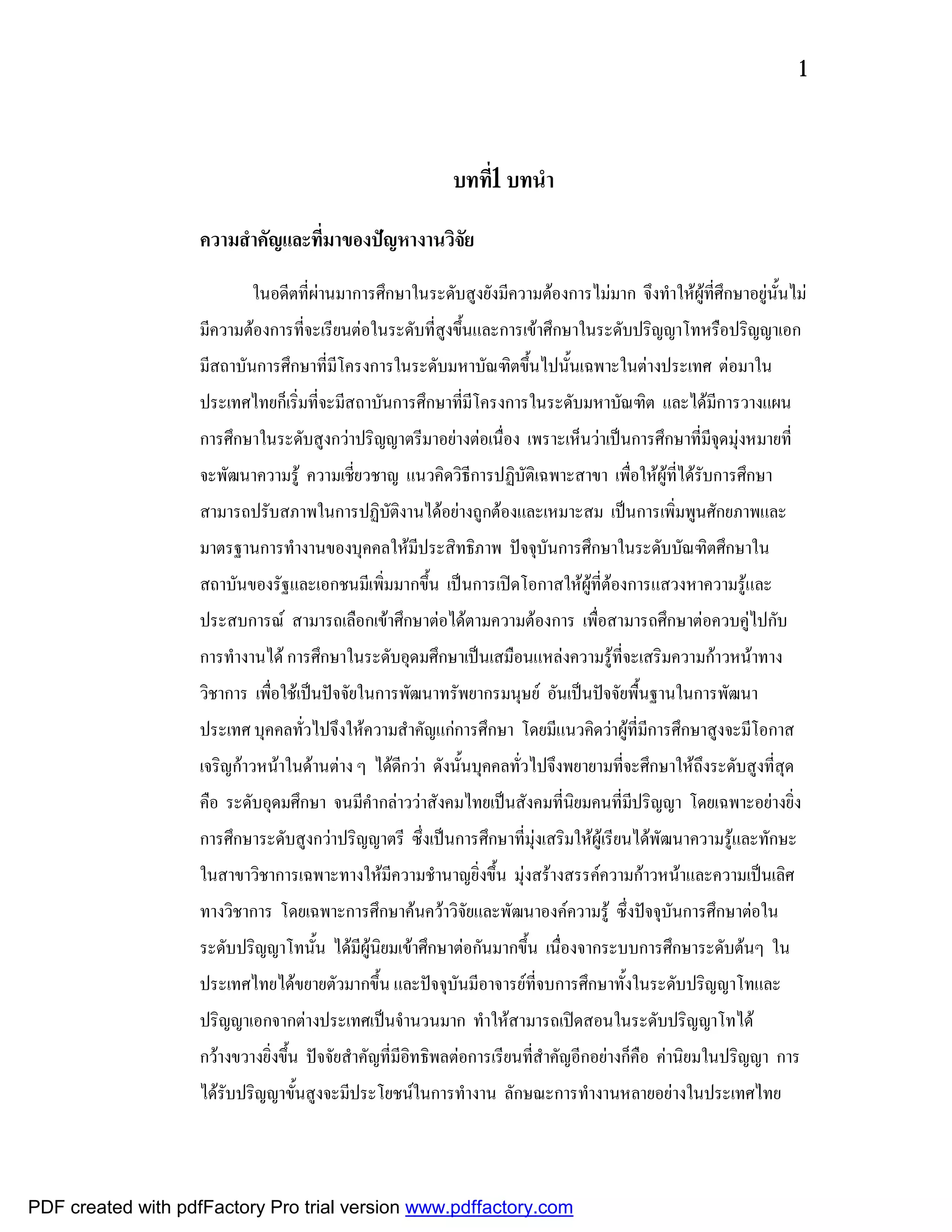 บทที่1 บทนํา ความสําคัญและที่มาของปญหางานวิจัย ในอดีตที่ผานมาการศึกษาในระดับสูงยังมีความตองการไมมาก จึงทําใหผูที่ศึกษาอยูนั้นไม มีความตองการที่จะเรียนตอในระดับที่สูงขึ้นและการเขาศึกษาในระดับปริญญาโทหรือปริญญาเอก มีสถาบันการศึกษาที่มีโครงการในระดับมหาบัณฑิตขึ้นไปนั้นเฉพาะในตางประเทศ ตอมาใน ประเทศไทยก็เริ่มที่จะมีสถาบันการศึกษาที่มีโครงการในระดับมหาบัณฑิต และไดมีการวางแผน การศึกษาในระดับสูงกวาปริญญาตรีมาอยางตอเนื่อง เพราะเห็นวาเปนการศึกษาที่มีจุดมุงหมายที่ จะพัฒนาความรู ความเชี่ยวชาญ แนวคิดวิธีการปฏิบัติเฉพาะสาขา เพื่อใหผูที่ไดรับการศึกษา สามารถปรับสภาพในการปฏิบัติงานไดอยางถูกตองและเหมาะสม เปนการเพิ่มพูนศักยภาพและ มาตรฐานการทํางานของบุคคลใหมีประสิทธิภาพ ปจจุบันการศึกษาในระดับบัณฑิตศึกษาใน สถาบันของรัฐและเอกชนมีเพิ่มมากขึ้น เปนการเปดโอกาสใหผูที่ตองการแสวงหาความรูและ ประสบการณ สามารถเลือกเขาศึกษาตอไดตามความตองการ เพื่อสามารถศึกษาตอควบคูไปกับ การทํางานได การศึกษาในระดับอุดมศึกษาเปนเสมือนแหลงความรูที่จะเสริมความกาวหนาทาง วิชาการ เพื่อใชเปนปจจัยในการพัฒนาทรัพยากรมนุษย อันเปนปจจัยพื้นฐานในการพัฒนา ประเทศ บุคคลทั่วไปจึงใหความสําคัญแกการศึกษา โดยมีแนวคิดวาผูที่มีการศึกษาสูงจะมีโอกาส เจริญกาวหนาในดานตาง ๆ ไดดีกวา ดังนั้นบุคคลทั่วไปจึงพยายามที่จะศึกษาใหถึงระดับสูงที่สุด คือ ระดับอุดมศึกษา จนมีคํากลาววาสังคมไทยเปนสังคมที่นิยมคนที่มีปริญญา โดยเฉพาะอยางยิ่ง การศึกษาระดับสูงกวาปริญญาตรี ซึ่งเปนการศึกษาที่มุงเสริมใหผูเรียนไดพัฒนาความรูและทักษะ ในสาขาวิชาการเฉพาะทางใหมีความชํานาญยิ่งขึ้น มุงสรางสรรคความกาวหนาและความเปนเลิศ ทางวิชาการ โดยเฉพาะการศึกษาคนควาวิจัยและพัฒนาองคความรู ซึ่งปจจุบันการศึกษาตอใน ระดับปริญญาโทนั้น ไดมีผูนิยมเขาศึกษาตอกันมากขึ้น เนื่องจากระบบการศึกษาระดับตนๆ ใน ประเทศไทยไดขยายตัวมากขึ้น และปจจุบันมีอาจารยที่จบการศึกษาทั้งในระดับปริญญาโทและ ปริญญาเอกจากตางประเทศเปนจํานวนมาก ทําใหสามารถเปดสอนในระดับปริญญาโทได กวางขวางยิ่งขึ้น ปจจัยสําคัญที่มีอิทธิพลตอการเรียนทีสําคัญอีกอยางก็คือ คานิยมในปริญญา การ ่ ไดรับปริญญาขั้นสูงจะมีประโยชนในการทํางาน ลักษณะการทํางานหลายอยางในประเทศไทย PDF created with pdfFactory Pro trial version www.pdffactory.com