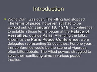 The document summarizes the key events of the Paris Peace Conference following World War I. The Big Four leaders (Wilson, Clemenceau, Lloyd George, and Orlando) debated the peace terms. Wilson proposed the Fourteen Points plan for lasting peace, including self-determination and a League of Nations. However, Britain and France prioritized punishing Germany. The resulting Treaty of Versailles blamed Germany for the war and imposed heavy reparations. It also redrew borders in Europe and divided former Ottoman lands into mandates. However, the treaty left bitter feelings on both sides and did not achieve a stable peace.