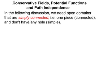 The document discusses conservative vector fields and potential functions. It defines a conservative field as one that is the gradient of a "nice" function, where the mixed partial derivatives are equal. A theorem is presented stating that a vector field F is conservative if and only if its partial derivatives satisfy fy = gx. An example shows a given vector field is conservative by verifying this condition. The potential function for the example field is then found by partial integration.