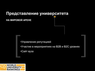 Документ обсуждает международное взаимодействие российских вузов и их репутацию на мировой арене, выделяя ключевые задачи, такие как повышение привлекательности для студентов и конкуренция в мировых рейтингах. Он также рассматривает факторы влияния на выбор вуза, необходимость использования различных информационных каналов и стратегий для формирования положительного имиджа. Упоминаются важные мероприятия, направленные на рекрутинг студентов и укрепление связей с выпускниками.