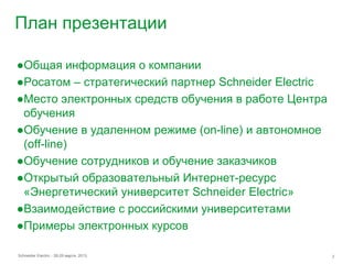 Документ описывает возможности электронного обучения в компании Schneider Electric, включая развитие онлайн-образования и подготовку сотрудников и клиентов. Упоминается о стратегическом партнерстве с Росатомом и внедрении технологий энергоэффективности. Также представлен обзор учебных курсов и мероприятий компании на русском и английском языках, направленных на обучение в области управления электроэнергией.