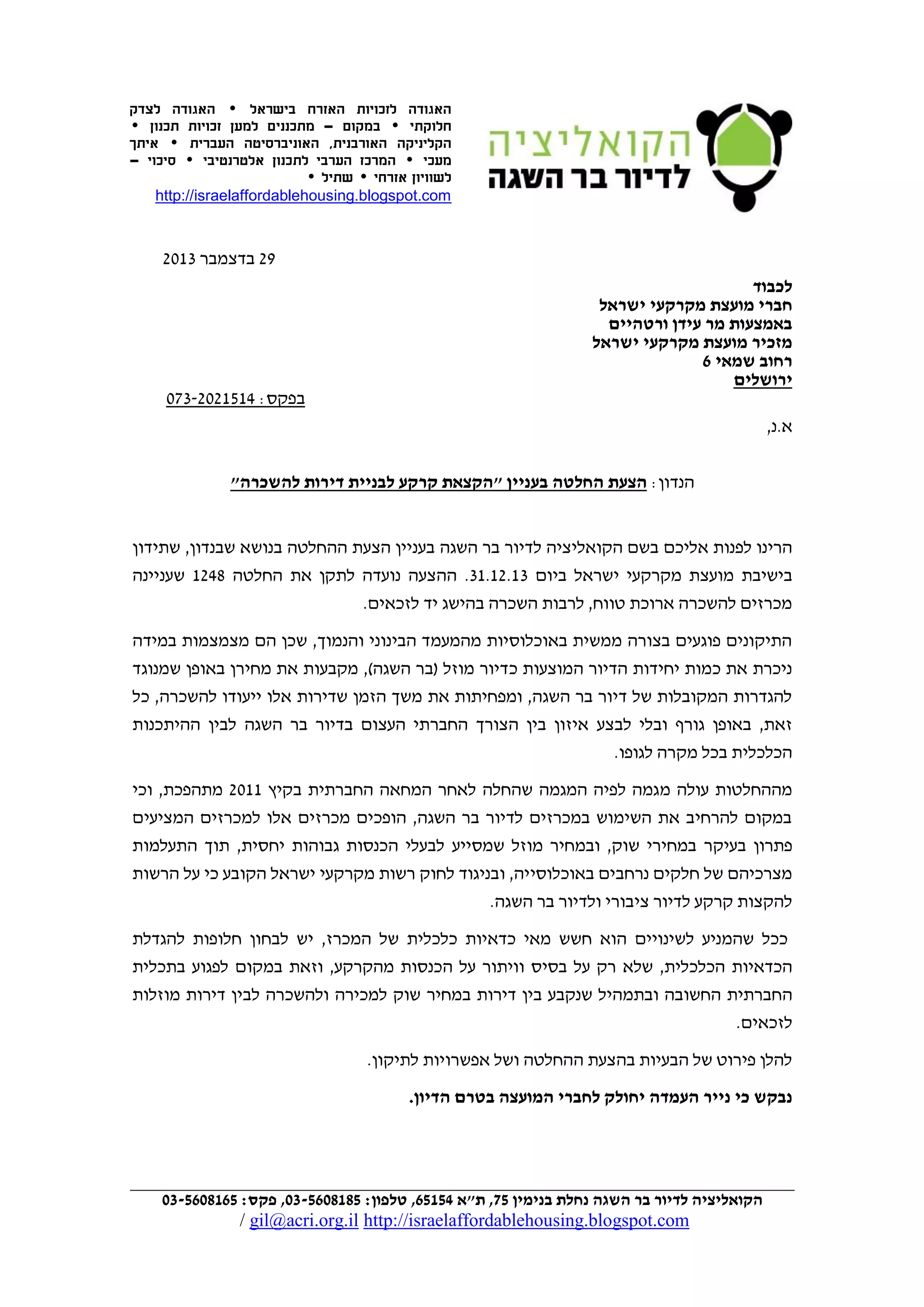 מכתב למועצת מקרקעי ישראל בעניין מכרזי השכרה 29.12.13