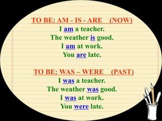 This document provides information about conjugating the verb "to be" in the past tense. It discusses using "was" and "were" for positive and negative statements as well as questions in the past tense. Examples are given for using "was" and "were" with different subjects in simple past statements, negative statements, and yes/no questions along with short answers.