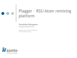 The document discusses Plagger, an open-source RSS/Atom aggregation platform that allows users to create customized feed applications by combining various plugin modules. It provides examples of how Plagger can be used to build applications for tasks like aggregating multiple feeds into a planet, downloading YouTube videos from RSS feeds, and transforming a Bloglines subscription into a Gmail feed. The document outlines the different types of plugin modules available in Plagger and provides specific examples for subscription, aggregation, filtering, publishing and notification plugins.