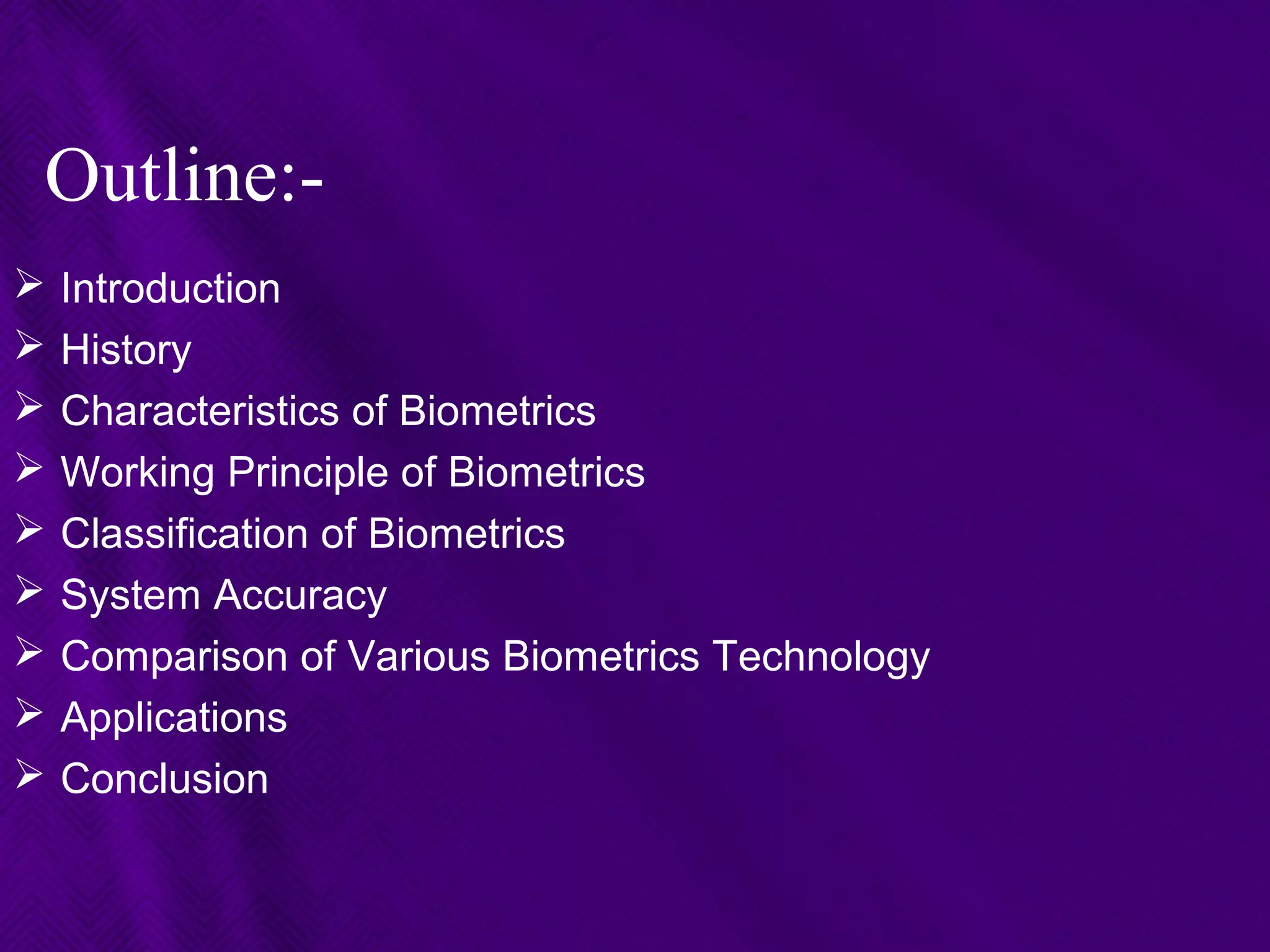 This document provides an overview of biometrics technologies. It begins with an introduction to biometrics and then discusses the history of biometrics from ancient Egyptians and Chinese using fingerprints to modern systems being developed in the 1970s. The document outlines key characteristics biometrics must have such as universality and permanence. It then classifies and describes various biometric technologies including fingerprint, face, iris, voice, and signature recognition. Application examples are presented for areas like gaming, television control, and accessibility switches. The document concludes that biometrics provide a user-friendly way to interact with devices without passwords while continuing to develop as an emerging field.