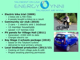 This document outlines several renewable energy and sustainability projects undertaken by a community in Wales since 2006, including a 36kW hydroelectric scheme that has produced over 1 million kWh of electricity and saved over 550 tonnes of fossil CO2. It also describes an electric bike trial, community car club with electric and biodiesel vehicles, solar panels installed on a village hall that charge an electric car, education programs delivered to local schools, and a planned local biodiesel production project using cooking oil from pubs and cafes.