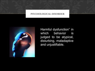 There are several major types of personality disorders and psychological disorders described in the document. Personality disorders represent long-standing and maladaptive patterns of behavior, cognition, and inner experience. Psychological disorders involve distress and impairment and can take many forms, from neurotic disorders like anxiety disorders to more severe conditions like schizophrenia. The document outlines various perspectives on the causes of disorders and therapeutic approaches used to treat them.