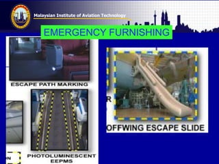 - First aid kits, oxygen masks, protective equipment, life jackets, life rafts, escape slides/chutes, and survival packs.