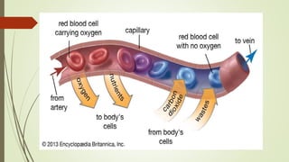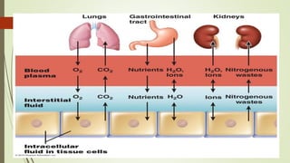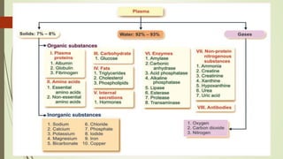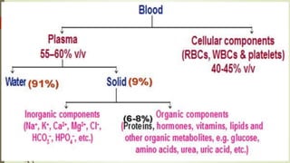 This document discusses blood physiology. It defines hematology as the study of blood and describes blood's role in connecting different parts of the body and transporting oxygen and carbon dioxide. Blood volume varies by sex and age. It is composed of blood cells suspended in plasma. Red blood cells carry oxygen, white blood cells fight infection, and platelets help clotting. Plasma is mostly water and contains nutrients, wastes, proteins, and electrolytes. Albumin maintains fluid balance while globulins aid immunity. Blood has key functions like respiration, nutrition, thermoregulation, and defense.
