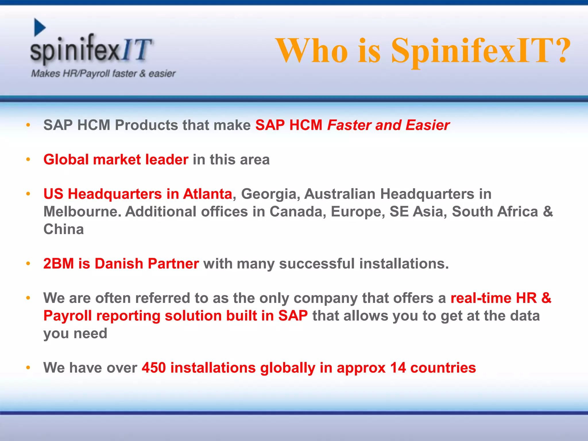 SpinifexIT is a global leader in business improvement software for SAP HR/Payroll. They have over 450 installations across 14 countries. Their solutions - Easy Reporter, Easy Help Desk, and Easy Clone - help streamline HCM reporting, simplify the employee help desk process, and automate report creation and delivery. Easy Reporter allows users to build, test, and deliver reports within SAP in minutes without ABAP coding. Easy Help Desk provides tools to resolve 80% of payroll queries on the first call by highlighting reasons for queries and providing reports to employees during calls.
