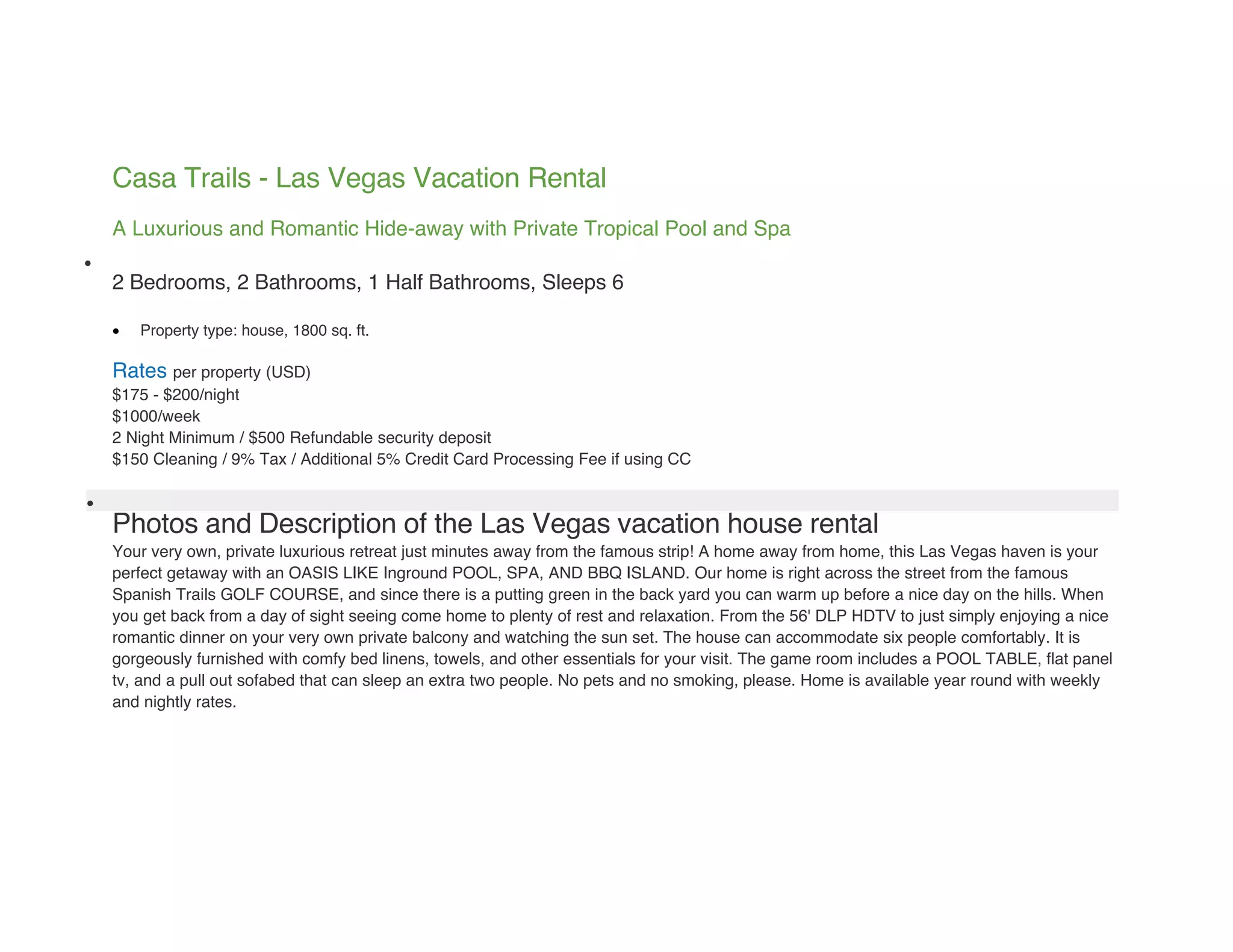 This listing describes a 2 bedroom, 2.5 bathroom luxury vacation house rental in Las Vegas located near the Las Vegas Strip and featuring an inground pool, hot tub, game room, and romantic balcony ideal for couples seeking a romantic getaway. The 1800 square foot home sleeps up to 6 people and offers amenities like a fully equipped kitchen, laundry facilities, cable TV, and WiFi. Nightly and weekly rental rates are provided starting at $175 per night.