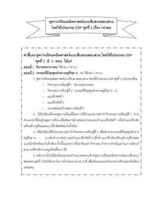 ชุดที่ 2 เรื่อง วงกลม คำชี้แจง ชุดการเรียนคณิตศาสตร์แบบสืบสวนสอบสวน โดยใช้โปรแกรม GSP ชุดที่ 2 มี 2 ตอน ได้แก่ ตอนที่ 1 นิยามของวงกลม (ใช้เวลา 2 คาบ) ตอนที่ 2 วงกลมที่มีจุดศูนย์กลางอยู่ที่จุด (h , k) (ใช้เวลา 2 คาบ) 1. ชุดการเรียนคณิตศาสตร์แบบสืบสวนสอบสวน โดยใช้โปรแกรม GSP ชุดที่ 2 ประกอบด้วย – กิจกรรมการเรียนรู้ที่ 1 นิยามของวงกลม – กิจกรรมการเรียนรู้ที่ 2 วงกลมที่มีจุดศูนย์กลางอยู่ที่จุด (h , k) – แบบฝึกหัดที่ 1 – แบบฝึกหัดที่ 2 – แบบทดสอบท้ายชุดการเรียนที่ 2 2. ให้นักเรียนศึกษาชุดการเรียนนี้โดยการใช้โปรแกรม GSP ทำกิจกรรมการเรียนรู้ที่ 1 ตาม คำแนะนำที่มีอยู่ในชุดการเรียน เพื่อค้นหานิยามของวงกลมและทำแบบฝึกหัดที่ 1 เมื่อทำแบบฝึกหัด เสร็จแล้ว ครูจึงเฉลยแบบฝึกหัดพร้อมกันทั้งห้อง 3. ให้นักเรียนใช้โปรแกรม GSP ทำกิจกรรมการเรียนรู้ที่ 2 เพื่อสำรวจวงกลมที่มีจุดศูนย์กลาง อยู่ที่จุด (h , k) แล้วทำการสรุป และทำแบบฝึกหัดที่ 2 เมื่อทำแบบฝึกหัดเสร็จแล้ว ครูจึงเฉลย แบบฝึกหัดพร้อมกันทั้งห้อง ทั้งนี้ในระหว่างที่นักเรียนทำกิจกรรม ถ้าหากเกิดปัญหาในการเรียนก็ สามารถที่จะซักถามครูหรือเพื่อน ๆ ได้ 4. หลังจากนั้นให้นักเรียนทุกคนทำแบบทดสอบท้ายชุดการเรียนคณิตศาสตร์แบบสืบสวน สอบสวน ชุดที่ 2 โดยให้เวลาในการทำประมาณ 20 นาที เพื่อเป็นคะแนนเก็บระหว่างเรียนของนักเรียน แต่ละคน