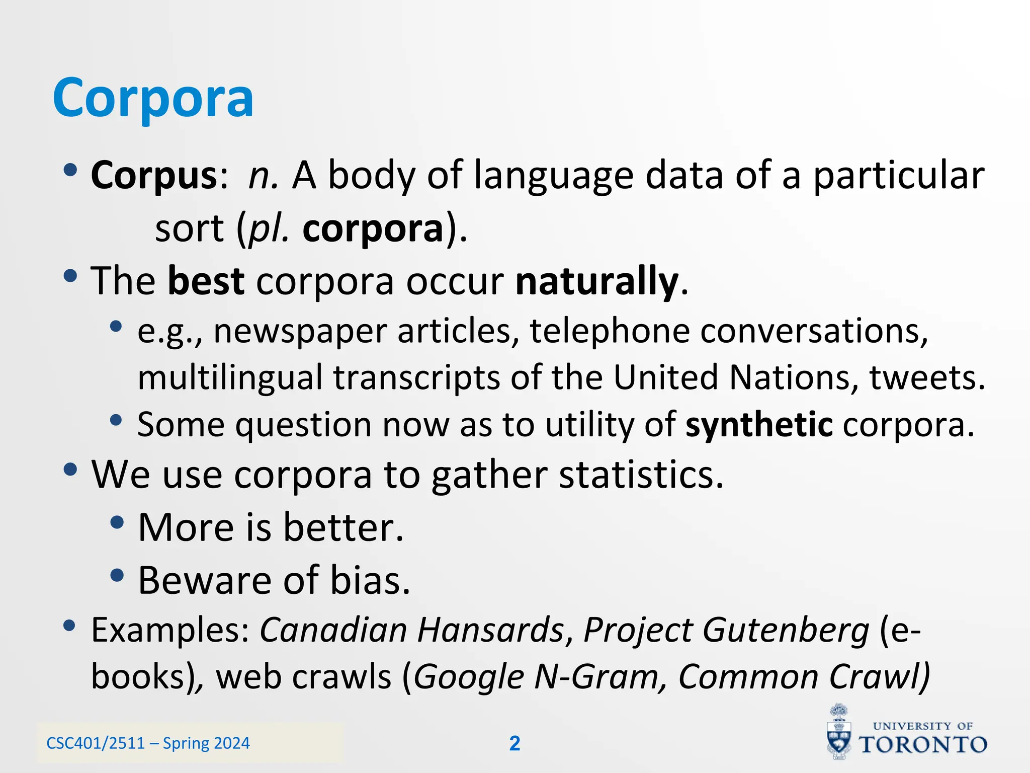This document discusses corpora, language models, and smoothing techniques for natural language processing. It begins by defining corpora as collections of natural language data used to gather statistics about language. It then discusses Zipf's Law, which notes that a few words are very frequent while many words are rare. The document introduces n-gram language models which predict the next word based on the previous n words. It notes issues with n-gram models like zero-probability events. The document then discusses smoothing techniques like Good-Turing discounting used to redistribute probability mass from frequent to rare events to address zero-probabilities.