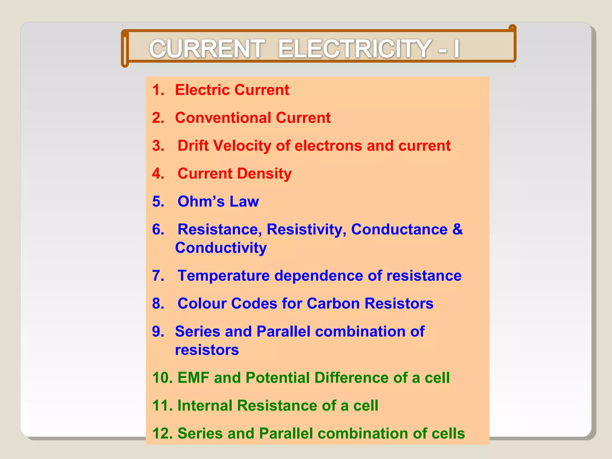 This document provides information about electric current and related concepts. It defines electric current as the rate of flow of charge and describes different types of current including steady, varying, and alternating current. It also defines conventional current, drift velocity, current density, and explains Ohm's law. The document discusses resistance, resistivity, conductivity, temperature dependence of resistance, and color codes for carbon resistors. It covers series and parallel combinations of resistors and cells. It also defines electromotive force (EMF), compares EMF and potential difference, and describes internal resistance of a cell and factors affecting it.