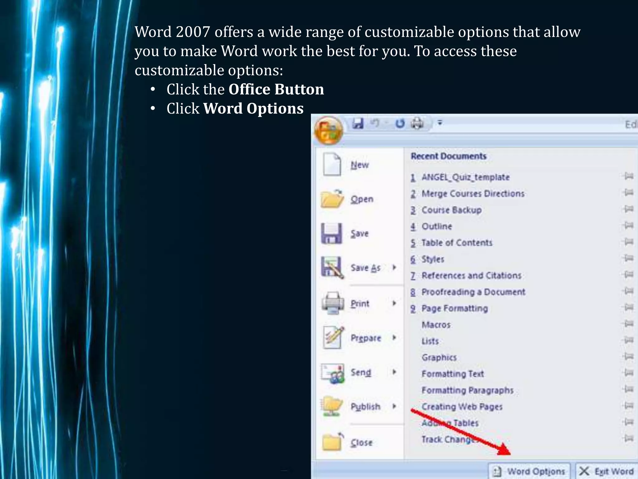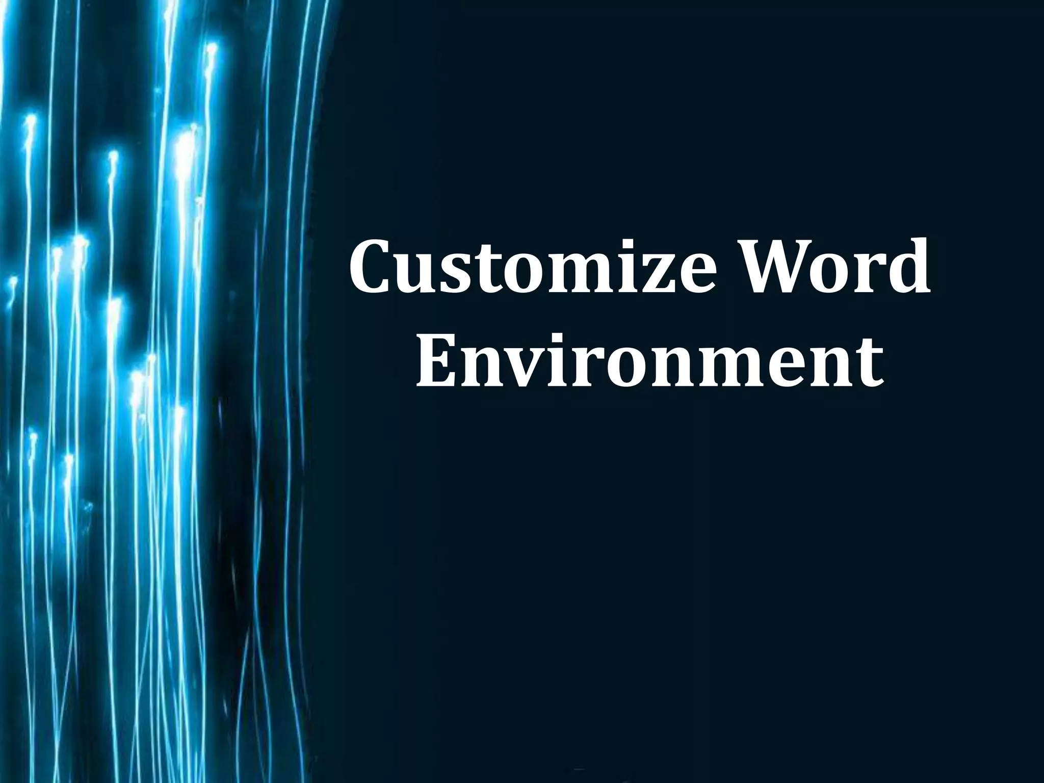 The document provides instructions for customizing various features in Microsoft Word to personalize the work environment. It describes how to access customizable options through the Office button and Word Options. It then explains how to modify features like the display, proofing, saving, and advanced settings. It also covers customizing the Quick Access toolbar by adding frequently used tools.