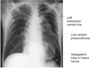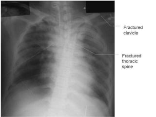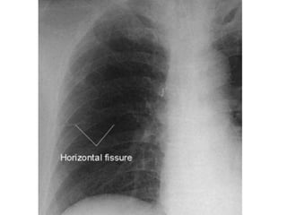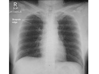 1. The document describes various lung abnormalities that can be seen on chest x-rays including pneumonia, pulmonary edema, atelectasis, consolidation, and pneumothorax.