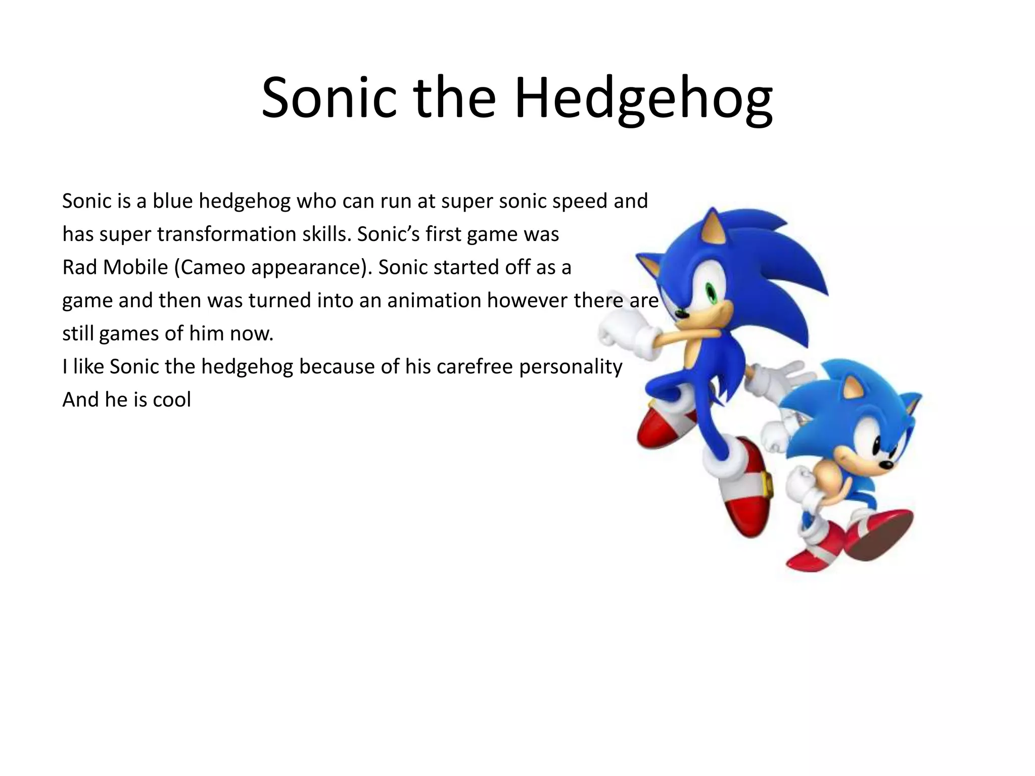 Sonic is a blue hedgehog known for his super speed. He started as a game character and later starred in animations. Blaze is a princess and guardian of the Sol Emeralds with a role similar to Knuckles, who protects the Master Emerald. Knuckles is a powerful red echidna introduced as a rival to Sonic in Sonic 3. Link travels through Hyrule to defeat Ganon while saving Zelda using legendary weapons. Shadow is a black and red hedgehog created to be the "ultimate life form" who can rival Sonic's speed with his hover shoes. Amy Rose is a pink hedgehog in love with Sonic and tries different methods to impress him.