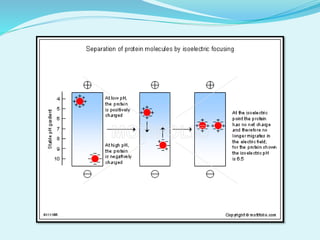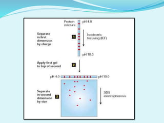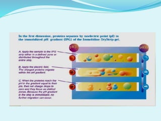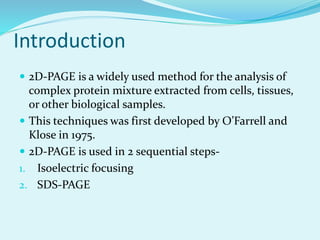 2D-PAGE is a technique used to separate complex protein mixtures based on isoelectric point and molecular weight. It involves two sequential steps - isoelectric focusing and SDS-PAGE. In isoelectric focusing, proteins are separated based on their isoelectric point in an immobilized pH gradient. They are then separated by SDS-PAGE based on their molecular weight. The separated proteins can then be visualized through staining and identified through mass spectrometry. While useful for proteomic analysis, 2D-PAGE has limitations such as low reproducibility and dynamic range.