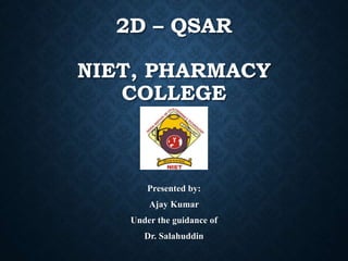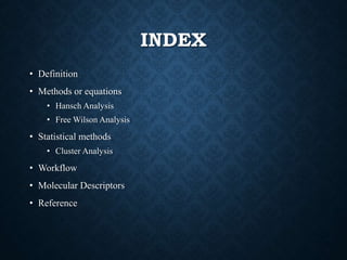 The document discusses 2D-QSAR (Quantitative Structure-Activity Relationship) analysis methods. It defines QSAR as mathematical relationships linking chemical structure and pharmacological activity. It describes several common 2D-QSAR methods including Hansch analysis, Free Wilson analysis, and various statistical methods. Cluster analysis is discussed as a way to group similar molecules and select a diverse subset for analysis. Molecular descriptors that encode structural, electronic, and topological properties are also introduced.