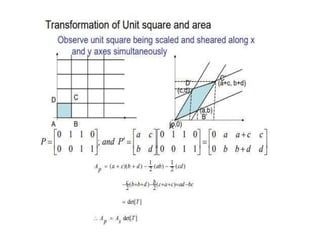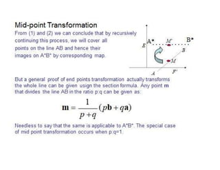 This document discusses 2D transformations including translation, rotation, scaling, shearing, and reflection. It explains how to represent points in 2D using vectors and matrices. Various transformation matrices are defined to transform points and geometries through translation, rotation about a pivot point, uniform and non-uniform scaling, reflection across lines or planes, and shearing. Composite transformations consisting of multiple simple transformations applied sequentially are also discussed. Examples are provided to demonstrate how common geometries like lines and polygons are transformed.