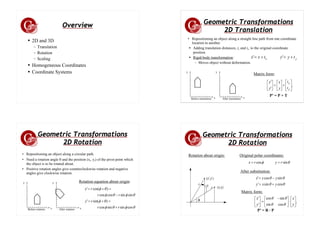 The document provides an overview of 2D and 3D geometric transformations including translation, rotation, scaling, and homogeneous coordinates. It then describes 2D translation, rotation, and scaling transformations through equations, matrix representations, and examples. Key points covered include: