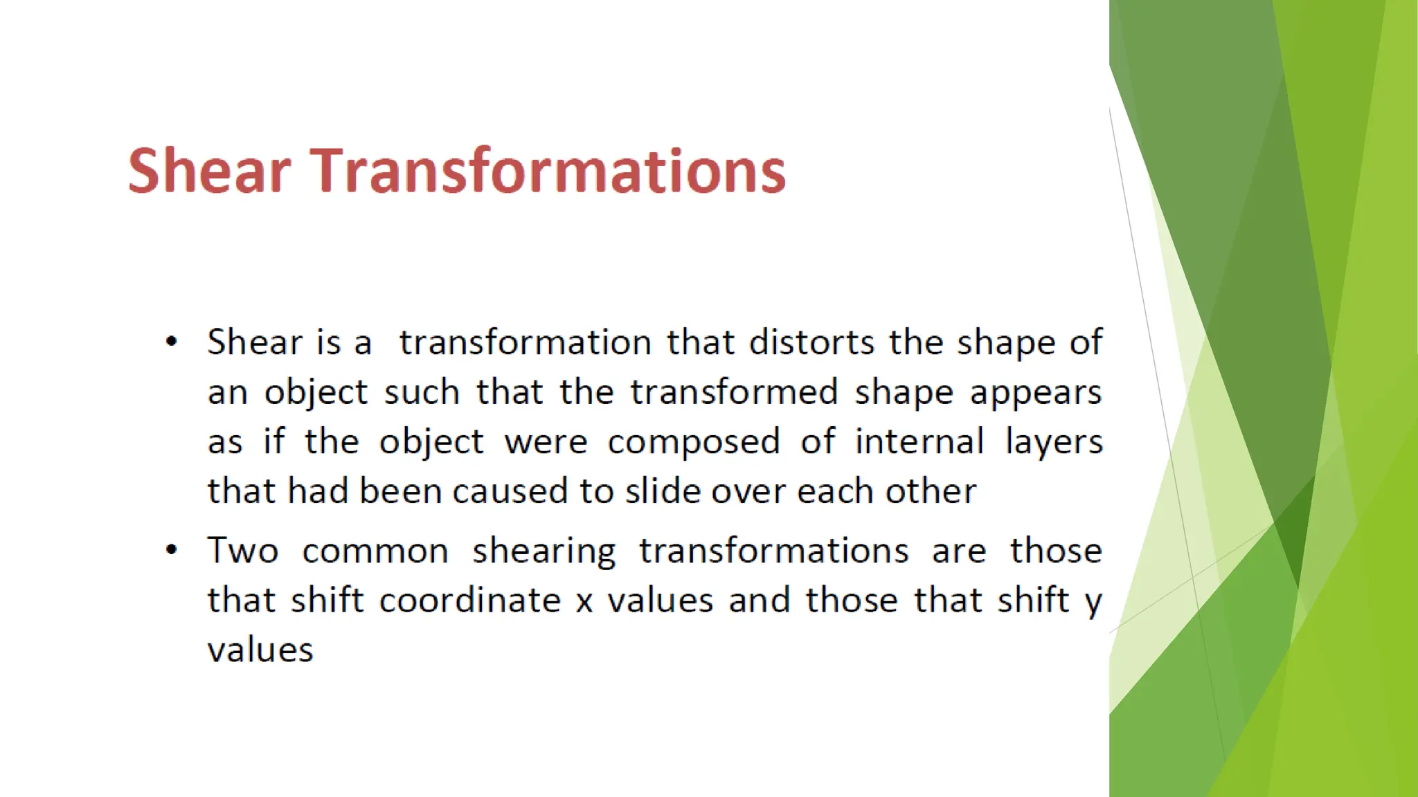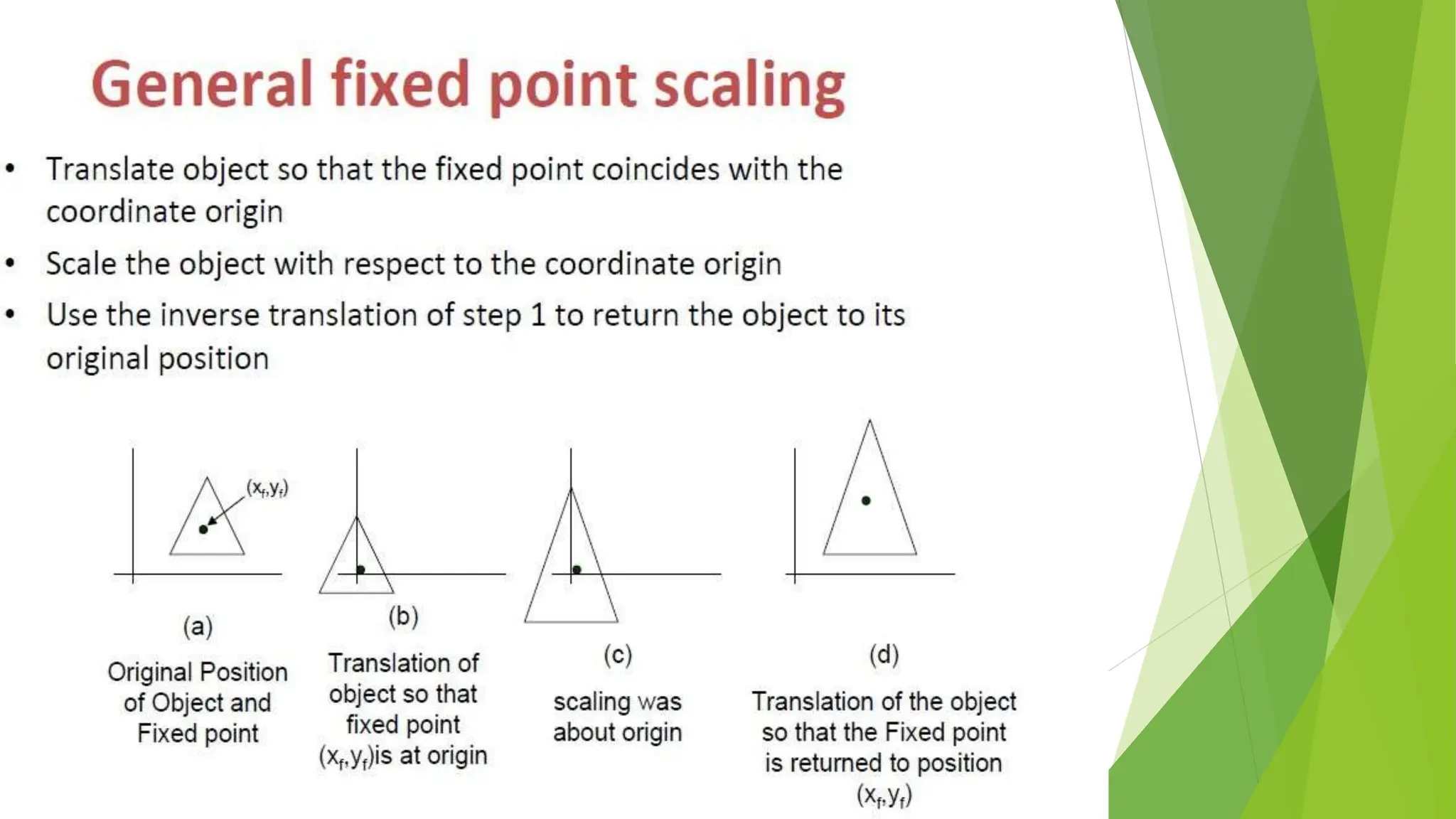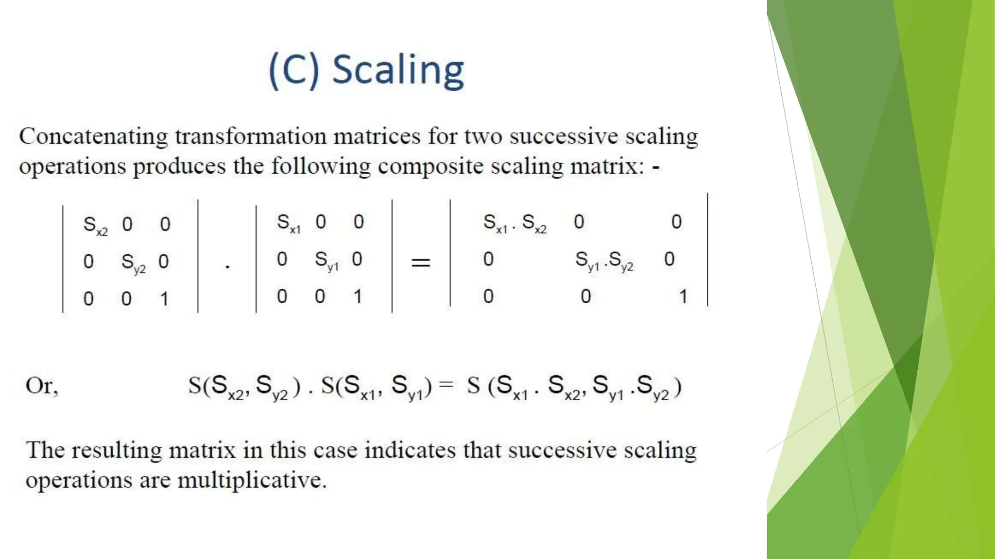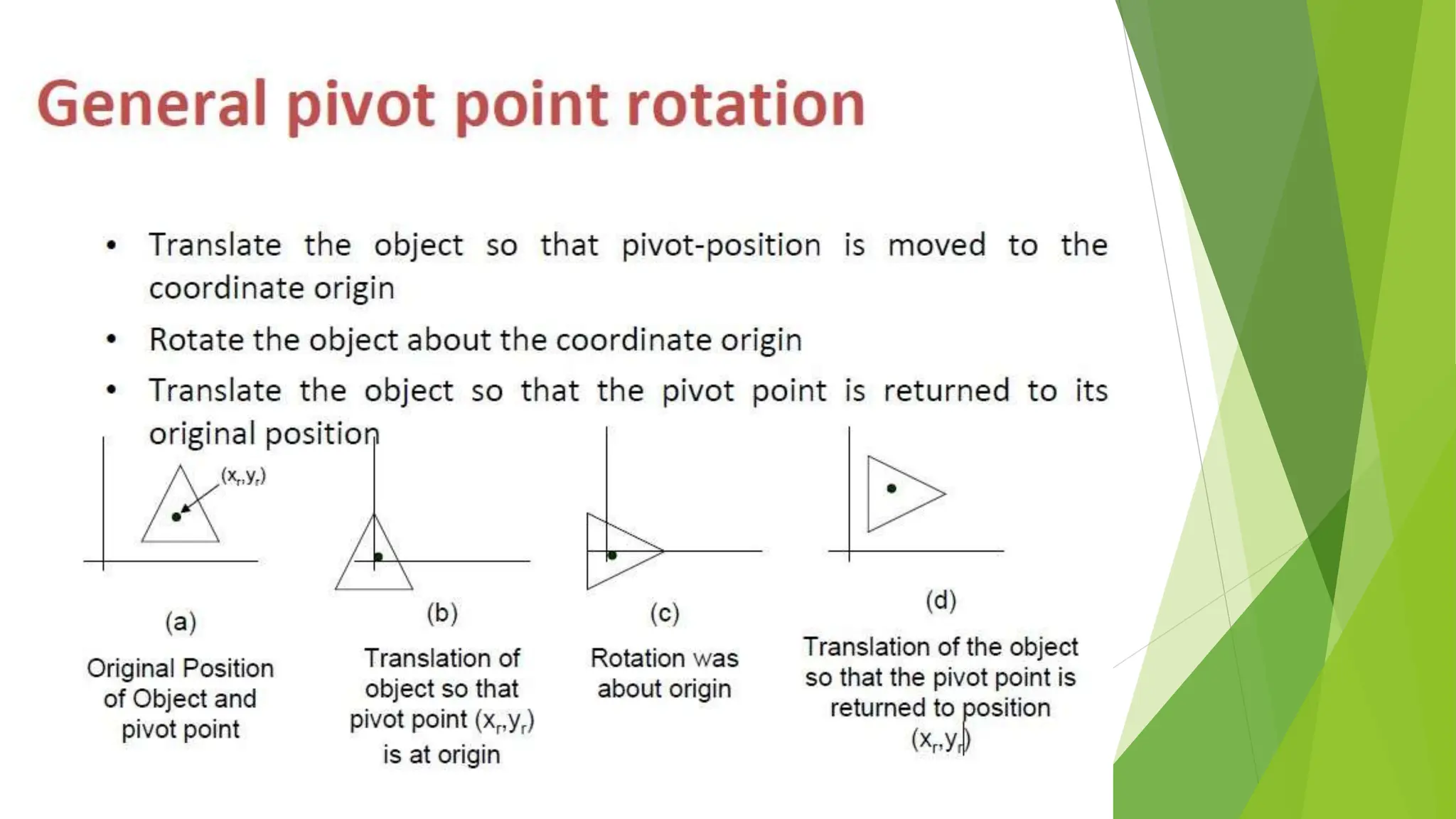 This document discusses 2D transformations in computer graphics, including translation, rotation, and scaling. Translation moves an object by adding offsets to x and y coordinates. Rotation uses trigonometry and rotation matrices to reposition objects around a central point. Scaling enlarges or shrinks objects by multiplying their coordinates by scaling factors. Homogeneous coordinates allow representing these transformations with matrix multiplications.