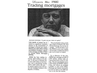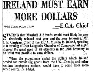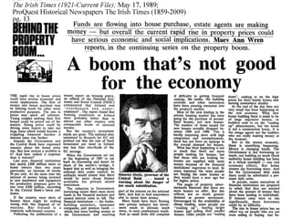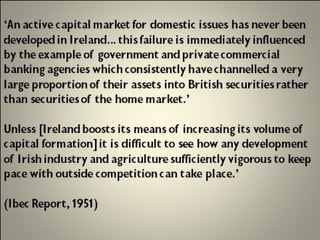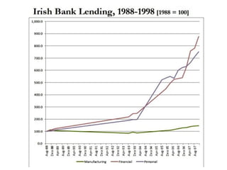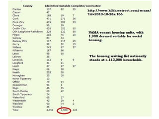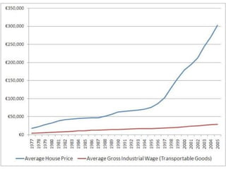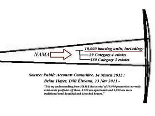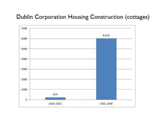 The document discusses the development of the Irish state in relation to housing policy and ownership. It notes that in the 1920s and 1930s, the Irish government aimed to promote home ownership through building grants and rates remissions for owner-occupiers. In the 1950s and 1960s, there was a push for private home ownership as a way to combat communism and social unrest. The 1966 Housing Act allowed many public housing tenants to purchase their homes, resulting in over 200,000 public units being sold into private ownership by the early 1990s. The global financial crisis that began in 2008 saw overbuilding and overborrowing inflate asset values in an unsustainable way according to the CEO of NAMA in 2011.