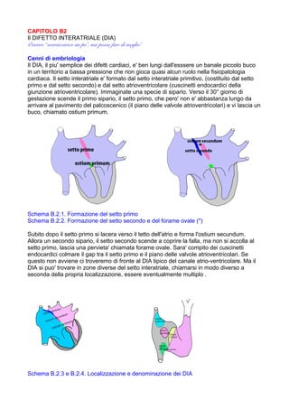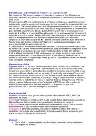 Il difetto interatriale (DIA) è un'anomalia cardiaca congenita che deriva da discontinuità nel setto interatriale, comportando variazioni nel flusso sanguigno tra gli atri e potenziali sovraccarichi cardiaci. La diagnosi avviene spesso incidentalmente in bambini asintomatici, mentre il trattamento può includere approcci percutanei o chirurgici, a seconda delle caratteristiche e della dimensione del difetto. Dopo la chiusura, i pazienti generalmente possono condurre una vita normale, ma richiedono monitoraggio per eventuali complicazioni e seguono un protocollo di follow-up regolare.