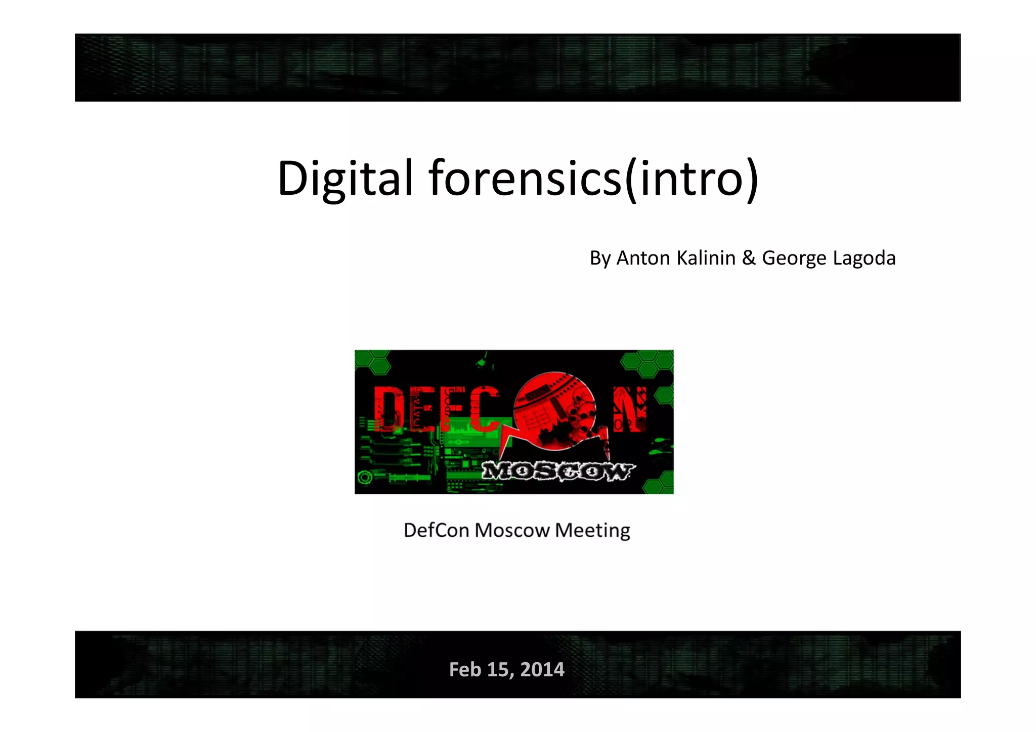 This document summarizes a digital forensics case discussion between two security experts, Anton and George. They describe recovering data from a damaged hard drive image to help an employee named Anna avoid legal trouble. Techniques discussed include recovering the partition table, system files to obtain machine details, searching for malware, and analyzing a keylogger log file. Ultimately they were able to obtain secret key files that were potentially used in a crime, helping resolve Anna's case.