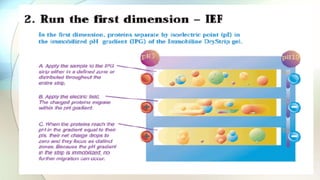 The document discusses the study of amino acids' properties, focusing on their pKa values, isoelectric points, and how titration curves can be used to analyze them. It details the 2D-PAGE technique for separating and identifying proteins based on their isoelectric point and molecular mass, highlighting its advantages in handling complex biological samples. Additionally, the document addresses challenges in protein analysis, including molecular weight limitations and reproducibility issues, while introducing 2D-DIGE as an advanced method to improve sensitivity and resolve gel variations.