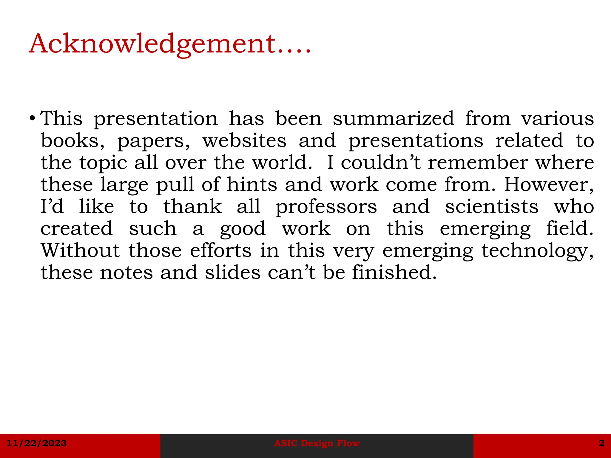 The document describes the basic ASIC design flow. It begins with system specification and proceeds through architectural design, functional design, register transfer level design, logic design, circuit design, layout, and verification and testing. However, the document notes that the design flow is not strictly linear and there can be interactions between stages that require going back to earlier stages. Timing closure is identified as resolving any timing issues that arise through iterations between physical design and earlier stages.