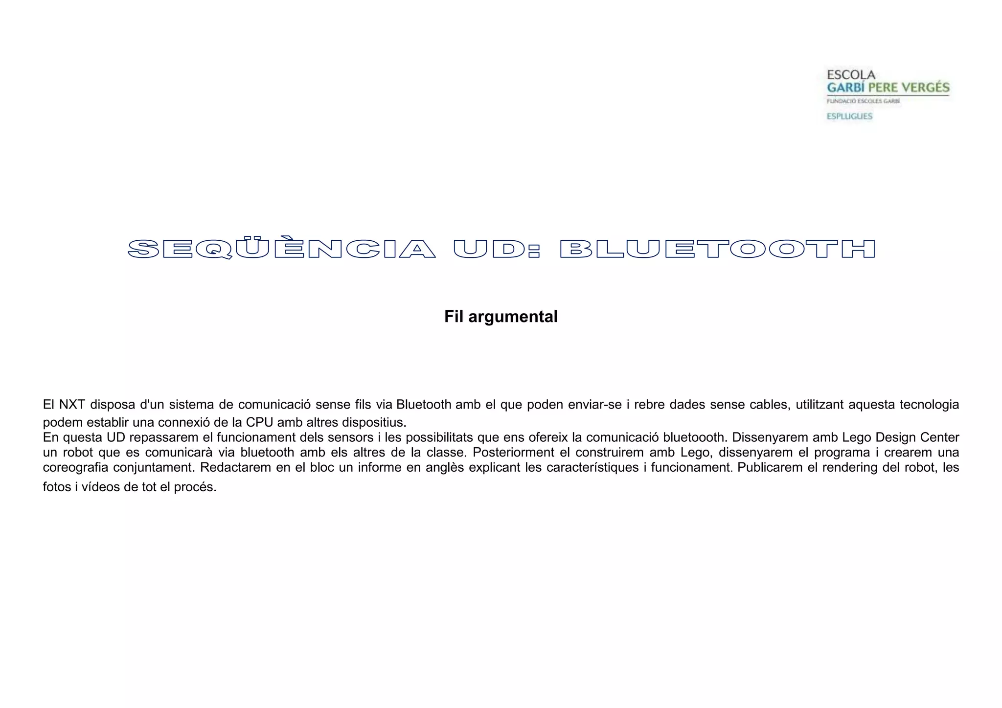 En questa UD repassarem el funcionament dels sensors i les possibilitats que ens ofereix la comunicació bluetoooth. Dissenyarem amb Lego Design Center un robot que es comunicarà via bluetooth amb els altres de la classe. Posteriorment el construirem amb Lego, dissenyarem el programa i crearem una coreografia conjuntament. Redactarem en el bloc un informe en anglès explicant les característiques i funcionament. Publicarem el rendering del robot, les fotos i vídeos de tot el procés.