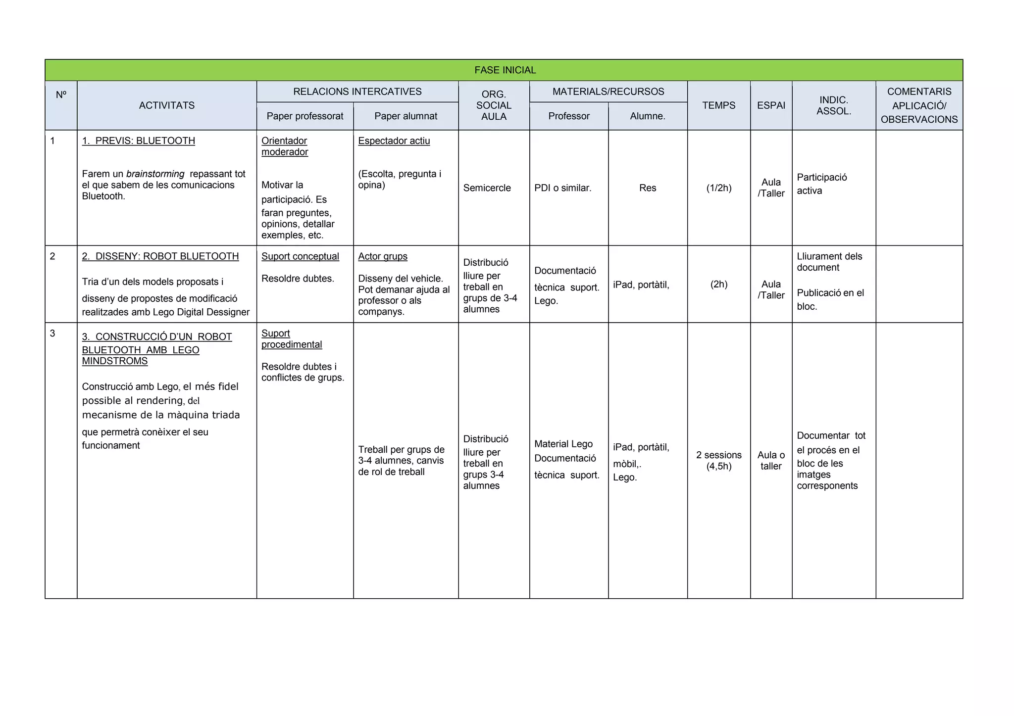 FASE INICIAL NºACTIVITATS RELACIONS INTERCATIVES ORG. SOCIAL AULA MATERIALS/RECURSOS TEMPS ESPAI INDIC. ASSOL. COMENTARIS APLICACIÓ/ OBSERVACIONS Paper professorat Paper alumnat Professor Alumne. 1 1. PREVIS: BLUETOOTH Farem un brainstorming repassant tot el que sabem de les comunicacions Bluetooth. Orientador moderador Motivar la participació. Es faran preguntes, opinions, detallar exemples, etc. Espectador actiu (Escolta, pregunta i opina)