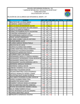 ALUMNOS QUE INTEGRAN EL GRUPO 2°F No. NOMBRE OCT DIC FEB ABR JUL TOTAL P P.FINAL 1 BAUTISTA DE LA CRUZ ANAHI 6.4 6.0 6.7 2 CABRERA JAIMES RODRIGO 6.0 7.0 6.5 3 CALVA AGUILAR BRANDON ALEXIS 6.0 6.0 baja 4 CALLETANO ACEVEDO DELWIN DIDIER 6.0 7.0 7.0 5 CASTILLO GARCIA PAMELA 7.5 8.4 9.4 6 CEBALLOS ROMERO RUTH VALENTINA 7.0 6.9 7.0 7 CORDOBA HERNANDEZ LUIS 7.6 7.0 6.0 8 COVARRUBIAS GARCIA LETICIA 9.5 10.0 10.0 9 CRUZ JACINTO BERENICE 8.5 7.8 6.8 10 DE ANDA GOMEZ CARLOS ANTONIO 6.3 6.9 6.0 11 DURAN MARIN JULIO 9.3 8.9 9.0 12 FLORES GARCIA YESICA PAOLA 6.7 5.9 6.0 13 GALICIA SILVA LUCIA 6.4 8.8 8.0 14 GARCIA ALCARAZ ANA KAREN 8.0 8.1 9.0 15 GOMEZ MARTINEZ ERICK ROBERTO 5.0 6.0 6.0 16 GONZALEZ FIGUEROA EDUARDO 9.0 8.3 9.0 17 GONZALEZ MONSIVAIS PAOLA 6.0 6.0 6.5 18 GUZMAN LONA LUIS ANGEL 6.0 5.9 7.4 19 HERNÁNDEZ BADILLO TERESA ANDREA 6.0 6.0 6.0 20 HERNANDEZ HERNANDEZ DIANA BERENICE 6.0 6.0 6.0 21 HERNANDEZ SEBASTIAN LUCILA 6.0 7.0 7.0 22 HERNANDEZ VALERIA BRENDA LIZETH 6.2 6.3 6.0 23 HERRERA ARRIAGA RODRIGO 6.0 6.0 5.4 24 HERRERA VARELA KEVIN 8.7 7.5 7.9 25 JIMENEZ RAMIREZ AYLIN JUNUETH 10.0 10.0 10.0 26 MARTINEZ FIGUEROA DAVID 6.4 9.4 9.5 27 NAJERA MARTINEZ JESUS RODRIGO 6.4 6.0 5.8 28 OROZCO MORALES WENDY JOANA 6.0 6.0 7.9 29 PALESTINA RUIZ LAURA PATRICIA 6.8 6.0 6.9 30 PALLARES FIGUEROA GLORIA JOCELIN 7.2 8.0 6.8 31 PEREZ GUZMAN FRIDA ITZEL 9.2 8.8 9.0 32 RAMIREZ REYNOSO EDER 6.0 7.9 6.5 33 RAMIREZ VARGAS ANGELICA MIRIAM 8.8 7.8 7.0 34 REYEZ MARTINEZ MAYRA VANESSA 5.0 6.0 7.0 35 RIVERA BOCANEGRA ANDRES ISRAEL 6.0 6.0 6.5 36 SILVA YAÑEZ KAREN CITLALI 6.0 7.3 6.0 37 TAPIA RESENDIZ ALAN ALEJANDRO 5.0 6.0 7.0 38 TORRES MARTINEZ JESUS 6.5 6.8 6.9 39 WINGARTZ GONZALEZ VALERIA 6.4 6.0 5.0 ESCUELA SECUNDARIA DIURNA No. 135 " UNIÓN DE REPÚBLICAS SOCIALISTAS SOVIÉTICAS " TURNO MATUTINO CICLO ESCOLAR 2014-2015