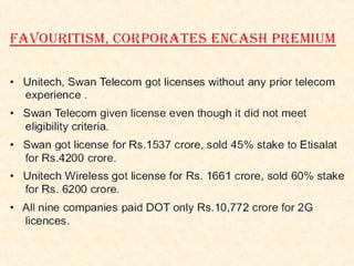The 2G spectrum scam involved Indian government officials and ministers undercharging mobile companies for licenses, leading to a massive financial loss estimated at $38.27 billion. Key figures included A. Raja, the telecom minister, and corporate lobbyist Nira Radia, with media allegations of complicity in the corruption. The scandal resulted in widespread political and legal ramifications, including the arrest of several officials and the revocation of numerous telecom licenses by the Supreme Court.