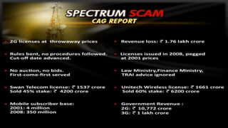 The 2G spectrum scam involved the Indian government issuing 122 telecom licenses in 2008 to several companies at 2001 prices, resulting in a 1.76 lakh crore rupee shortfall. A. Raja, the then telecom minister, was accused of undervaluing 2G licenses which were then resold by companies at huge profits. The CAG, CBI, and CVC are investigating the scam, while several politicians, bureaucrats, and journalists are also under scrutiny for their alleged roles. The CPI(M) has demanded cancellation of licenses and a fresh auction to recover losses.