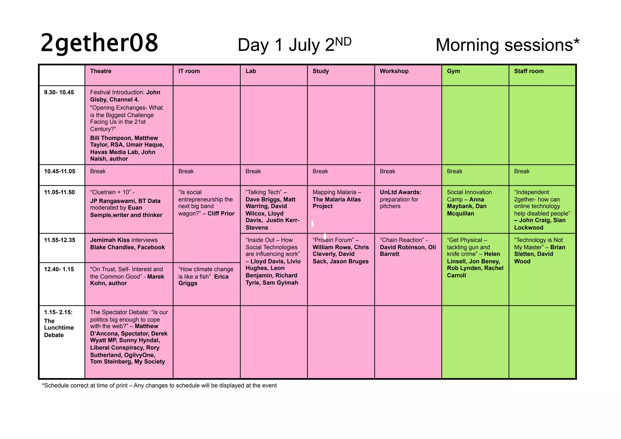 The document appears to be a schedule for Day 1 of a July 2nd event listing morning session activities from 9:30-11:50 taking place in different rooms including a theatre, IT room, lab, study area, workshop, gym, and staff room. The first session in the theatre is listed as a festival introduction followed by an opening exchange on the biggest challenge facing the 21st century featuring several speakers. A break is then scheduled from 10:45-11:05 across all rooms before subsequent sessions resume until 11:50.